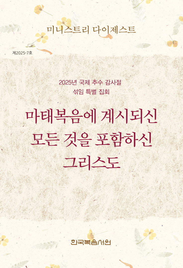 이 책의 내용은 교회생활의 각 방면과 관련된 것이며, 2025년 국제 추수 감사절 섞임 특별 집회의 주제인 “마태복음에 계시되신 모든 것을 포함하신 그리스도”에 맞게 추구용으로 편집한 것입니다.