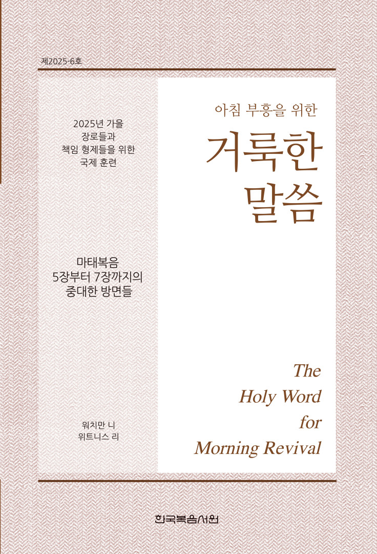 1.이 책은 믿는 이들이 말씀 안에 계신 주님과 함께하는 매일의 아침 부흥 시간을 발전시키고, 2025년 9월 25일부터 27일까지 말레이시아의 클랑에서 열린 “마태복음 5장부터 7장까지의 중대한 방면들”에 관한 가을 장로들과 책임 형제들을 위한 국제 훈련 내용을 부분적으로 복습할 수 있도록 만들어졌습니다. 말씀 안에 계신 주님을 친밀하게 접촉함으로 믿는 이들은 생명과 진리로 조성되며, 그리스도의 몸의 건축을 위해 교회 집회에서 신언할 수 있도록 장비됩니다.