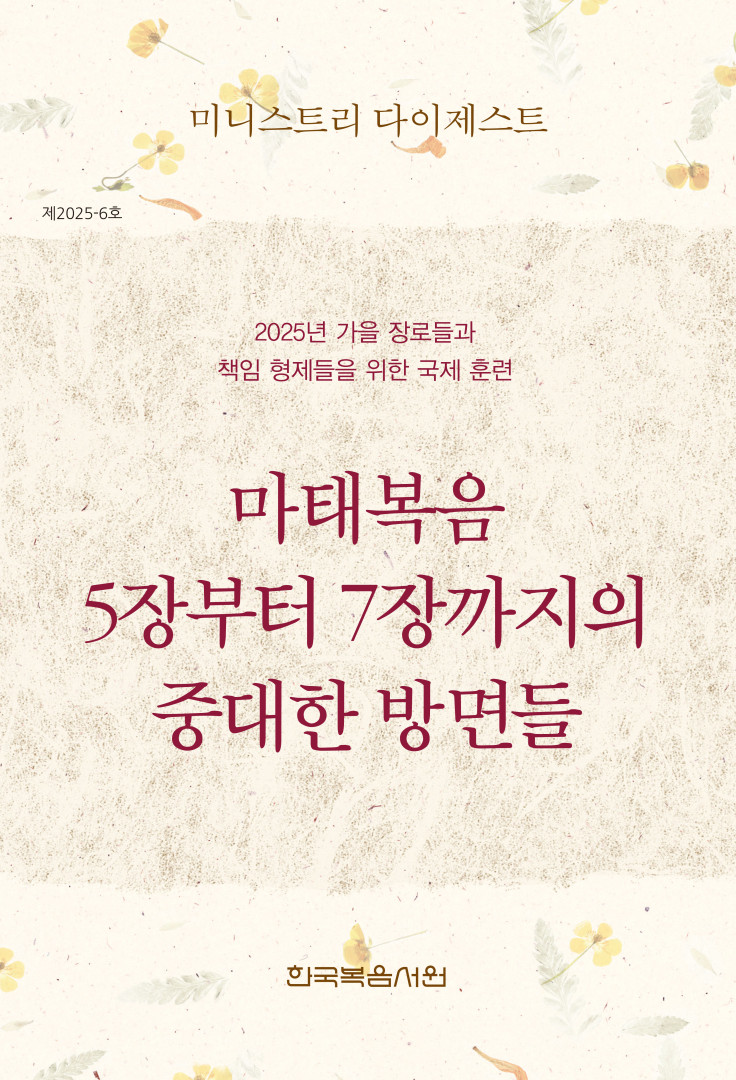 《미니스트리 다이제스트》는 워치만 니와 위트니스 리의 저서에서 발췌한 내용으로 되어 있으며, 7차 집회에서 교통된 주제를 근거로 하여 진리와 생명과 봉사와 복음의 네 항목으로 나누어서 각지 교회 성도들의 교회생활의 다양한 방면의 필요를 채우기 위해 만들어졌습니다. 이 책의 메시지들은 개인 추구, 복음 전파, 가정 집회에서의 목양, 소그룹에서의 추구, 기도 집회 및 봉사자 집회에서 사용하기에 적합합니다. 이 책의 내용은 교회생활의 각 방면과 관련된 것이며, 2025년 가을 장로들과 책임 형제들을 위한 국제 훈련의 주제인 “마태복음 5장부터 7장까지의 중대한 방면들”에 맞게 추구용으로 편집한 것입니다. 양식의 각 메시지와 관련된 다이제스트 부분을 ‘대조표’에 따라 참고하여 추구함으로, 각 메시지의 부담 안으로 더 깊고 풍성하게 들어갈 수 있습니다. ‘찬송하는 사람들’ 부분은 대만복음서원에서 발행한 《찬송하는 사람들》이라는 계간지에 수록된 찬송들과, 한국복음서원에서 발행한 찬송가 및 〈내 마음의 노래〉 증보판에 실린 찬송들을 소개한 것입니다.