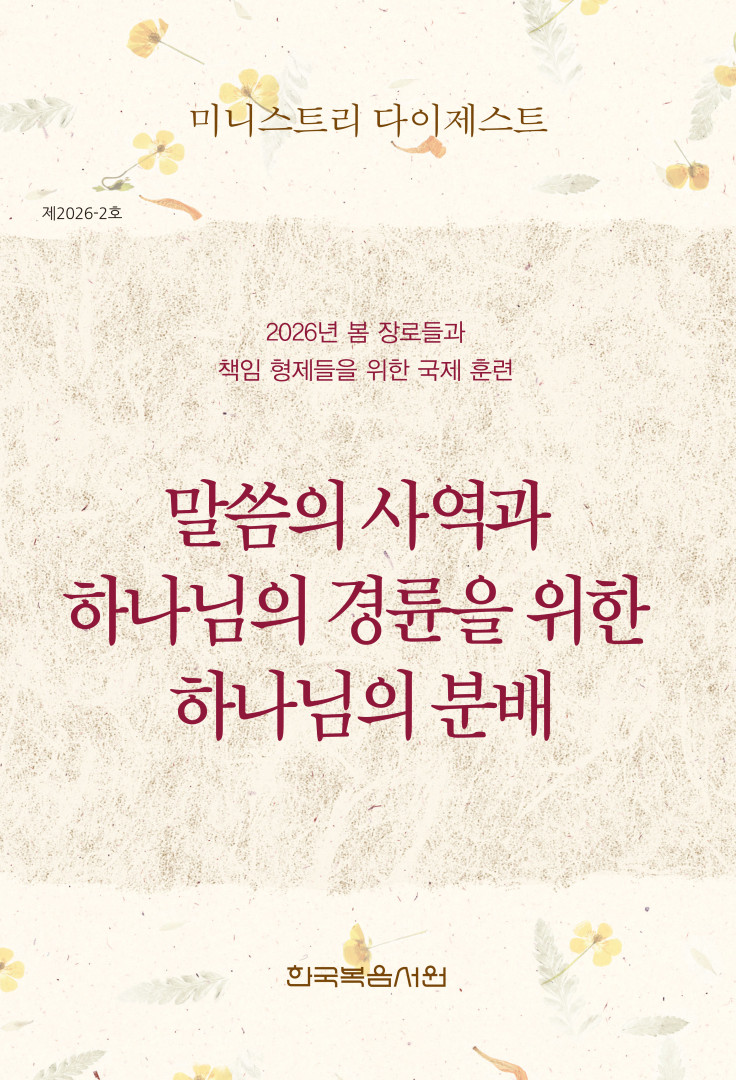 서문《미니스트리 다이제스트》는 워치만 니와 위트니스 리의 저서에서 발췌한 내용으로 되어 있으며, 7차 집회에서 교통된 주제를 근거로 하여 진리와 생명과 봉사와 복음의 네 항목으로 나누어서 각지 교회 성도들의 그리스도인의 생활과 교회생활의 다양한 방면의 필요를 채우기 위해 만들어졌습니다. 이 책의 메시지들은 개인 추구, 복음 전파, 가정 집회에서의 목양, 소그룹에서의 추구, 기도 집회 및 봉사자 집회에서 사용하기에 적합합니다.이 책의 내용은 그리스도인의 생활과 교회생활의 각 방면과 관련된 것이며, 2026년 봄 장로들과 책임 형제들을 위한 국제 훈련의 주제인 “말씀의 사역과 하나님의 경륜을 위한 하나님의 분배”에 맞게 추구용으로 편집한 것입니다.양식의 각 메시지와 관련된 다이제스트 부분을 ‘대조표’(9쪽)에 따라 참고하여 추구함으로, 각 메시지의 부담 안으로 더 깊고 풍성하게 들어갈 수 있습니다. ‘찬송하는 사람들’ 부분은 대만복음서원에서 발행한 《찬송하는 사람들》이라는 계간지에 수록된 찬송들과, 한국복음서원에서 발행한 찬송가 및 〈내 마음의 노래〉 증보판에 실린 찬송들을 소개한 것입니다.